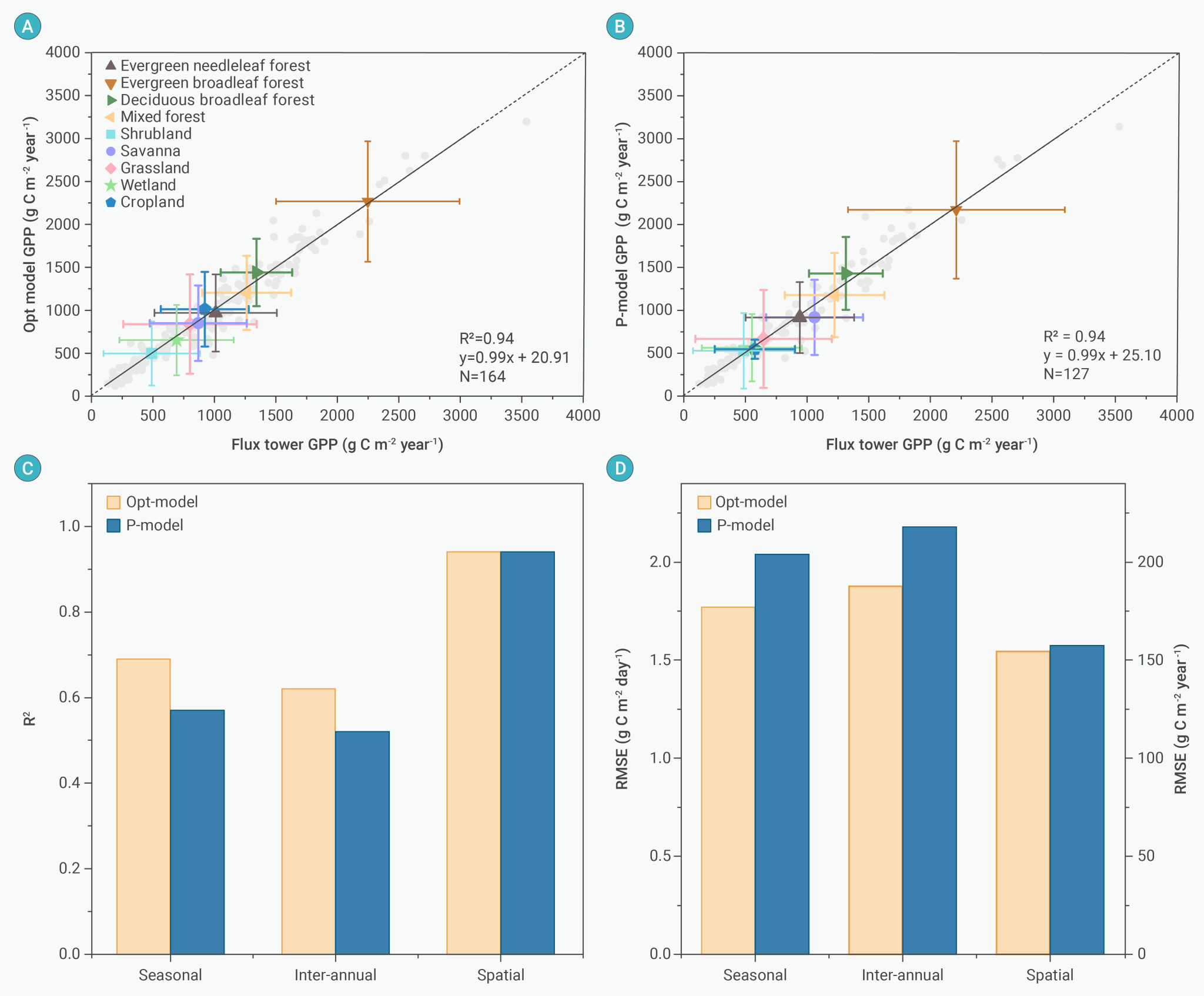 与全球164个通量塔站点观测结果对比显示,Opt模型能准确捕捉GPP跨站点的空间变异(图2A),与经典的P模型表现相当(图2B)。同时,Opt模型在季节尺度和年际尺度上表现出更稳定的模拟能力(图2C-D)。