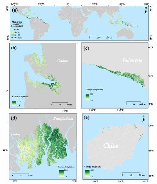 全球红树林冠层高度图:b-e 机载激光雷达站点位置分别为:加蓬、印度尼西亚、孙德尔本斯、海南(中国)