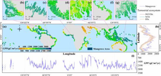 红树林生态系统GPP的空间分布。(a) 红树林生态系统GPP全球分布,平均分辨率为0.5°×0.5°;(b-g)分别放大Everglades国家公园、Gurupi-Piria海洋开采保护区、Edumanom国家森林、Sundarban国家公园、Terusan、Deception Bay红树林生态系统GPP的空间分布;(h)本研究估算的红树林生态系统GPP与DGVMs、RS和MTE估算的陆地生态系统GPP的纬度分布;(i)红树林生态系统GPP的经向分布