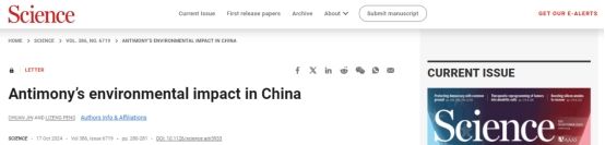 生态服务功能监测与评估团队成员靳川博士联合山东省农业科学院彭立增研究员,在《Science》上发表题为“Antimony’s environmental impact in China”的Letter评述文章。靳川博士为该文第一作者,彭立增研究员为共一/通讯作者。该文章探讨了中国锑(Sb)污染的现状及其对生态环境和人类健康的威胁,并呼吁通过在环境介质、生物体中进行广泛的数据收集,优先开发生物传感器并结合生物修复技术来控制这一重金属污染,为化学环境污染管理提供了宝贵的见解和策略。