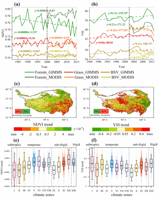 2 (a-b)1982-2015年青藏高原不同植被NDVI和敏感性(VSI指标)的时间动态,(c-d)为对应趋势的空间格局,(e-f)为不同气候分区下NDVI和VSI的变化趋势
