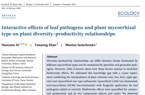 席念勋副教授在国际生态学著名期刊Ecology上以“Interactive effects of leaf pathogens and plant mycorrhizal type on plant diversity–productivity relationships”为题发表最新研究成果。