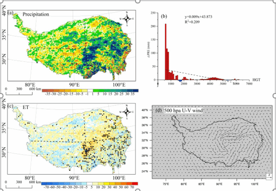 图2地表属性变化对青藏高原(a)降水、(c)蒸散和(d)500hPa U-V风的影响及(b)降水沿海拔梯度的分布状况