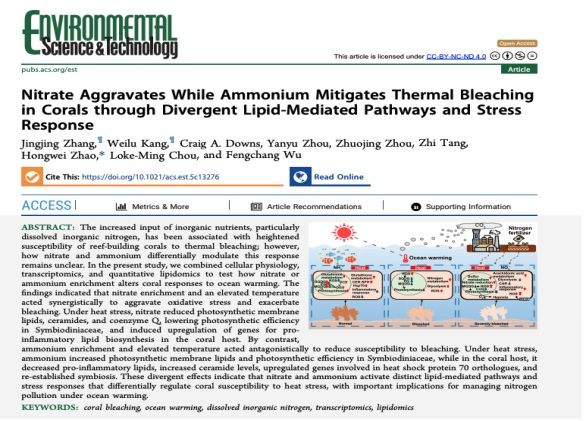 海南省珊瑚礁生态学国际联合研究中心赵洪伟教授科研团队完成的重要研究揭示了不同形态的氮污染物——硝态氮和铵态氮,在国家一类海水水质相关浓度下,对受热胁迫的珊瑚会产生截然相反的生理效应。该研究成果为深入理解气候变化与营养盐污染复合作用对珊瑚礁生态系统的影响提供了全新视角,并首次提出了一个可指导水质管理的具体硝酸盐浓度阈值。相关论文已发表于Nature Index收录期刊《Environmental Science & Technology》。