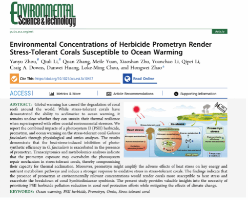 近日,生态与环境学院在读博士生周彦妤、李秋丽及硕士毕业生袁美乐等在国际著名期刊 Environmental Science & Technology上发表了题为“Environmental concentrations of herbicide prometryn render stress-tolerant corals susceptible to ocean warming”的研究论文(//doi.org/10.1021/acs.est.3c10417),,并入选当期封面(Supplementary cover)。