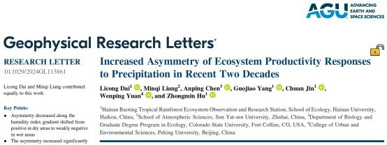 Dai, L., Liang, M., Chen, A., et al. (2025). Increased asymmetry of ecosystem productivity responses to precipitation in recent two decades. Geophysical Research Letters*, 52, e2024GL113861. //doi.org/10.1029/2024GL113861