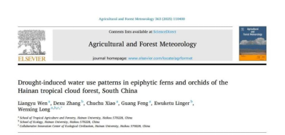 论文题目为《Drought-induced water use patterns in epiphytic ferns and orchids of the Hainan tropical cloud forest, South China》,发表在Agricultural and Forest Meteorology期刊,硕士研究生文良玉为第一作者,龙文兴教授为通讯作者。该研究所设计的控制实验装置获得国家发明专利授权,得到了国家自然科学基金面上项目(31870508)资助。(//doi.org/10.1016/j.agrformet.2025.110400)