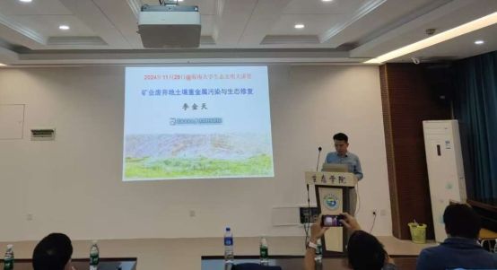 李金天教授以《矿业废弃地土壤重金属污染与生态修复》为主题,讲述了矿业废弃地土壤的主要特征是“两低一高”(即营养元素含量低、植物多样性低和重金属浓度高),并针对矿业废弃地土壤的这三个特征提出了三个科学问题:土壤缺磷的关键因素及其调控机制是什么?植物多样性的作用及其机制是什么?生物污染及其控制原理是什么?随后详细介绍了每个科学问题的解决思路、手段和主要成果发现。李教授团队取得的相关成果在实际应用层面构建了重金属矿业废弃地生态修复的直接植被技术体系,并实现了大规模的应用。最后,参会师生就报告中的学术问题与李金天教授进行了深入交流。