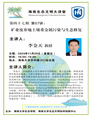 20241129日下午,海南生态文明大讲堂第四十七期第57讲在农科楼207会议室成功举办。本次讲座由华南师范大学生命科学学院李金天教授主讲,素人AV 副院长(挂职)刘文杰教授主持。
